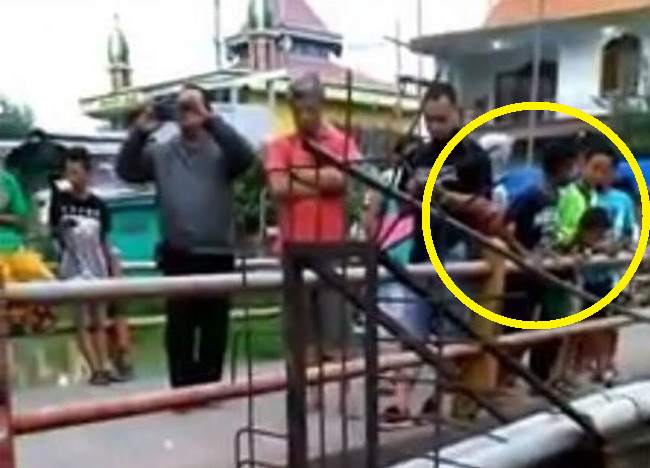 gif_animation インドネシアにて、小学生男子を含む多数の地元住民が橋の上から見つめる先に、”若い女性のおっぱい” が。詳細は分かっていないが、女性の死体発見現場・画像。