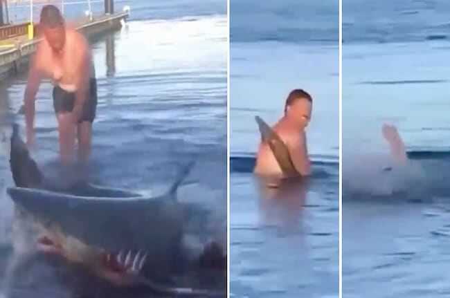 オーストラリアより衝撃映像。海で浅瀬に打ち上げられたサメを海に戻してあげた心優しいオジサンが、サメに食べられてしまう…。動画はオジサンが海中に消える所で終わっているため、実際に食われたのか、また生死などは不明である。