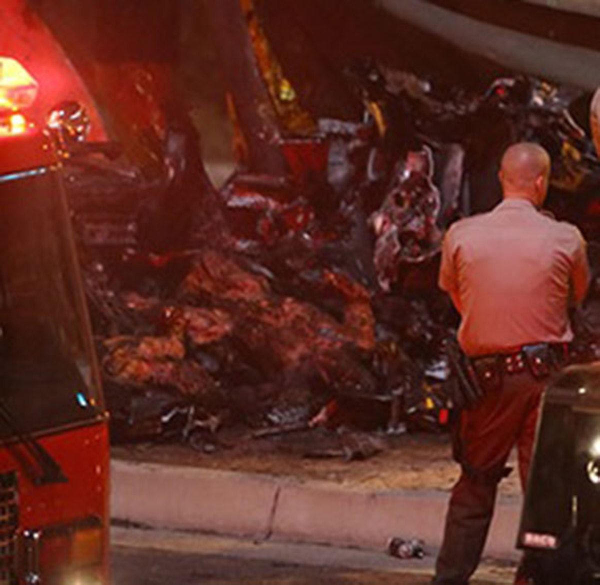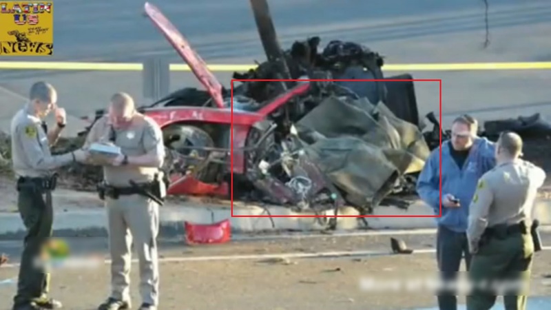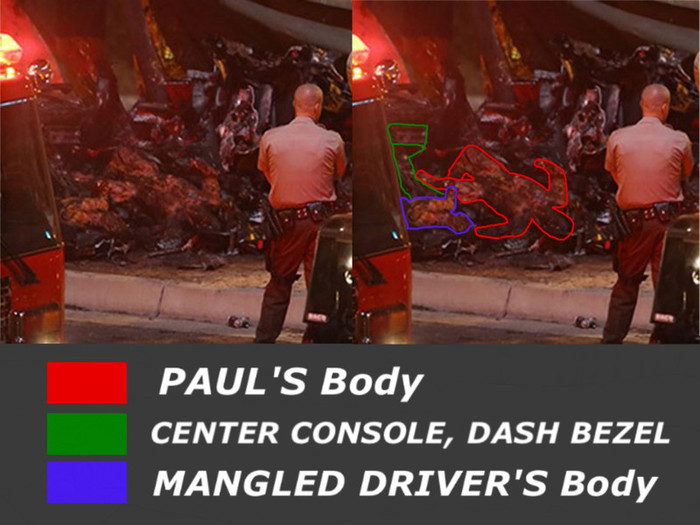 先月30日、交通事故により死亡したアメリカの俳優、「ポール・ウォーカー」の流出した死体写真。車は衝突後炎上したためはっきりとした姿は確認できないものの、おそらく死亡した2人であろうと言われているもの。(ポール・ウォーカー、車を運転していた友人のロジャー・ロダス)、”