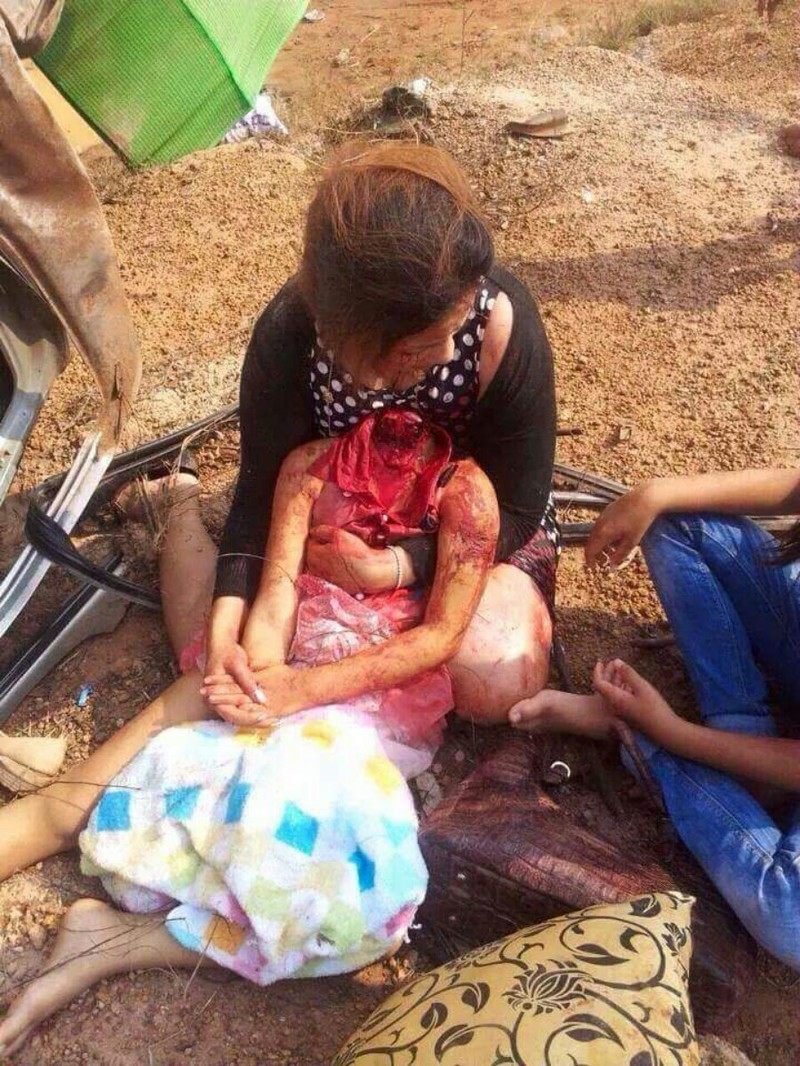 gif_animation とある事故現場。トラックと大型トラックとの衝突。首のない小さな娘を母親が、首だけになった娘を父親が大事そうに抱えている。[5]images