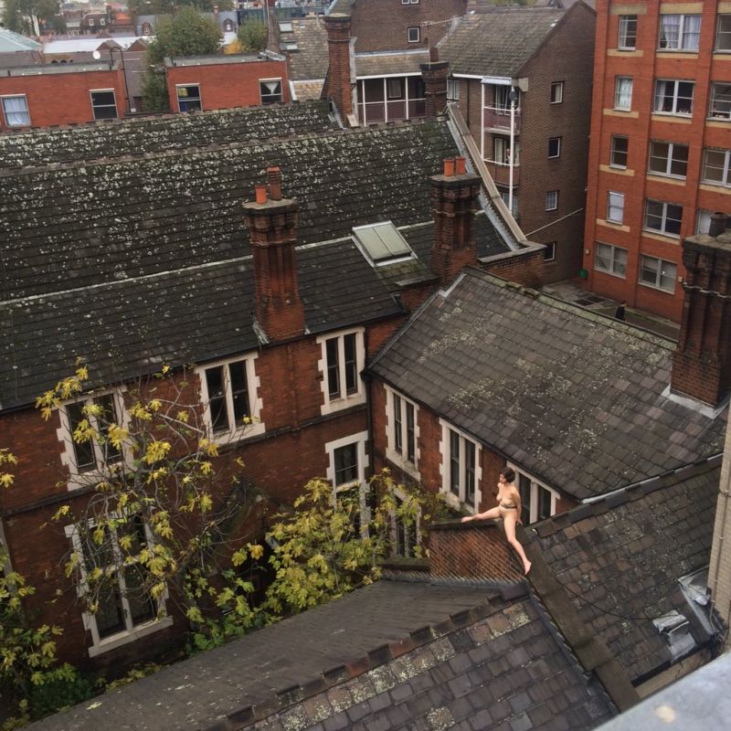 gif_animation イギリス・ロンドンにて、とある投稿者が自宅の窓から撮影した光景。屋根の上に4時間(午後1時~5時まで)、全裸のまま座り続ける女性。情報によると彼女は ”パフォーマンス・アーティスト” であり、それはパフォーマンスの一環であったそう。