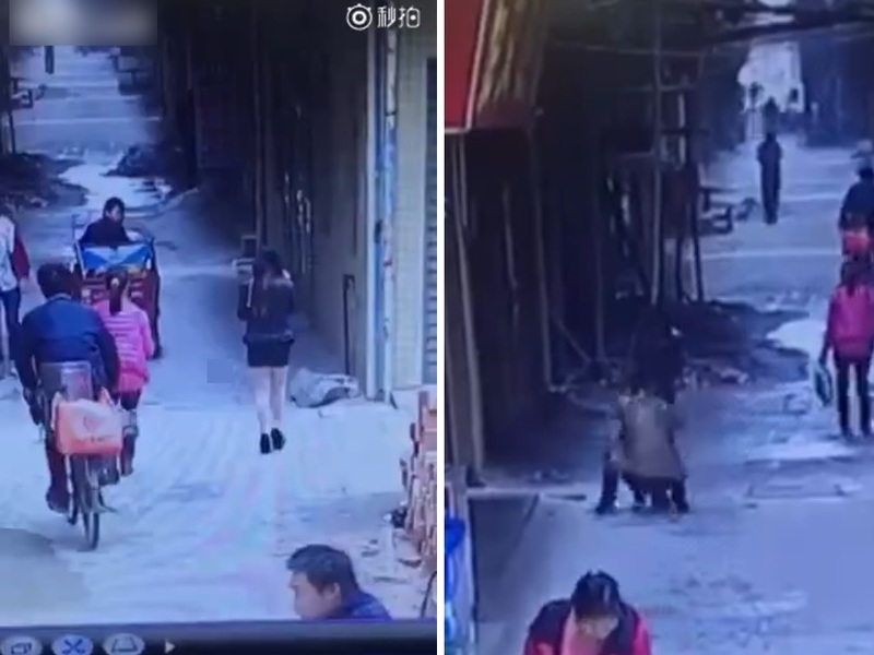 中国にて、人々が行き交う路地に突如現れた変態男の映像。歩いてるミニスカートの若い女性に後ろから近づき、無理やり下着を奪っていく。