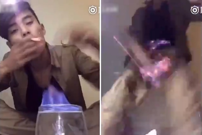 gif_animation 中国にて、SNSにクールなビデオをアップしようと試みた少年は、違う意味でネット中の話題をさらう事になった。グラスに注いだアルコールに火を点け、タバコをふかす少年。結果的にその火は少年の股間に燃え移る…。