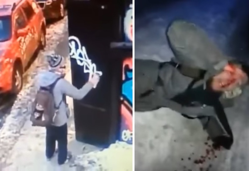 街中で違法なストリートアート(落書き)を描いているDQNが街の親父に捕まり、ボッコボコにされて泣きながら許しを請う様子。流血注意。