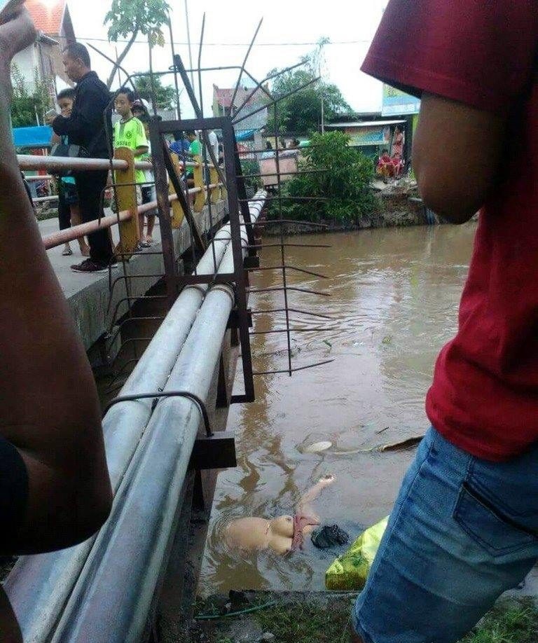 gif_animation インドネシアにて、小学生男子を含む多数の地元住民が橋の上から見つめる先に、”若い女性のおっぱい” が。詳細は分かっていないが、女性の死体発見現場・画像。