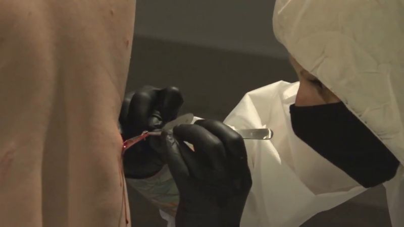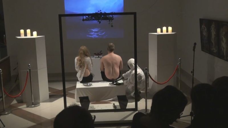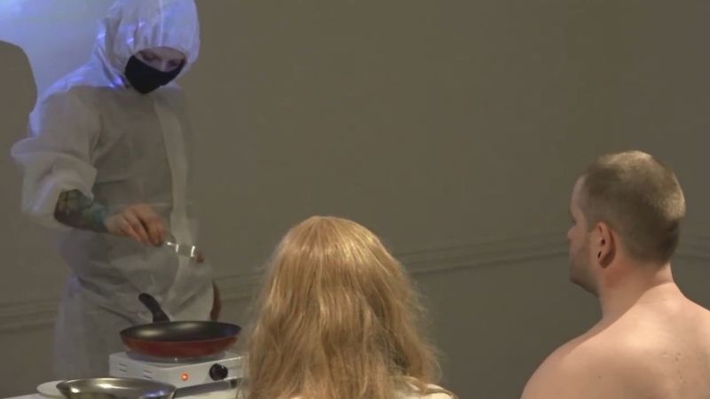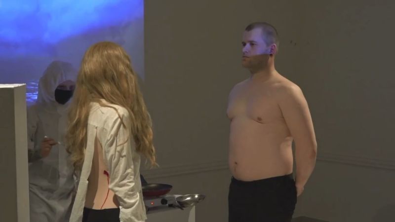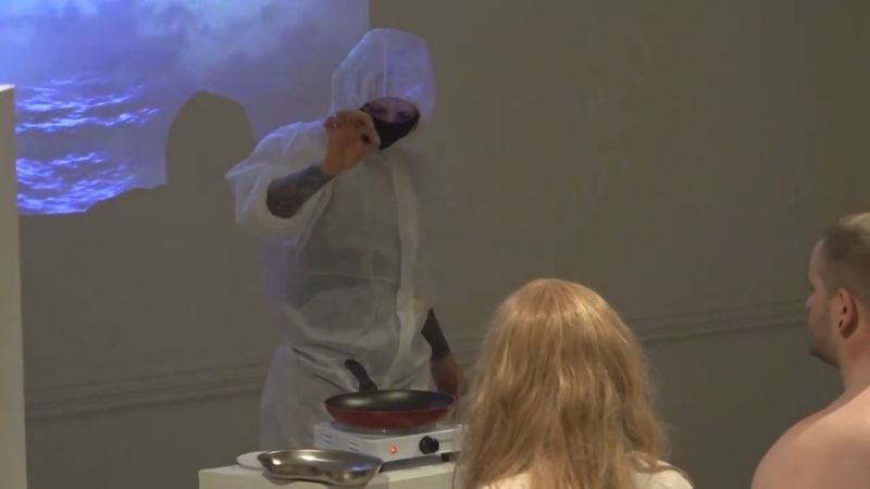 ラトビアにて、”現代アート”(現代美術)として行われたパフォーマンスが話題になっている画像・動画。モデル2人(男女)の背中の肉を切り取り、フライパンで焼いて食べさせる…。数十人の観客たちの前で披露された恐ろしい光景。[15]images
