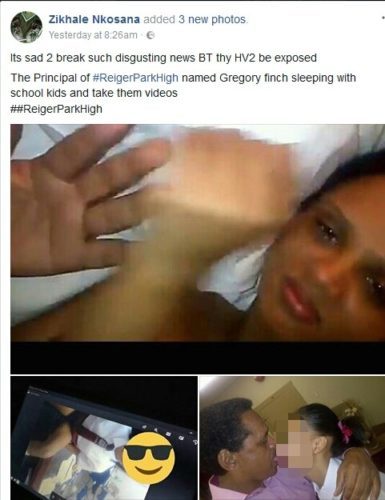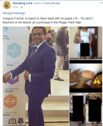 南アフリカ共和国にて、高校の校長先生が女子高生34人、女教師5人と性的関係を持ち逮捕されたという衝撃的なニュース。逮捕のきっかけはSNS上にアップロードされたエロ画像(行為中の画像など?)の一部であり、余罪なども調べられている。[10]images