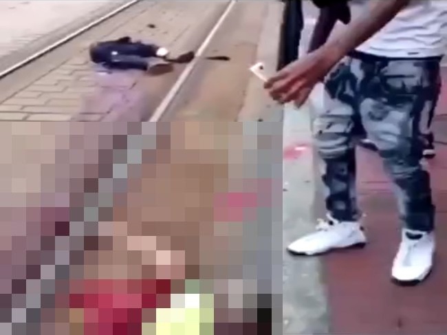 アメリカ・メリーランド州ボルチモアにて、電車に轢かれ半分に千切れて死亡した高齢の女性を、ノリノリで撮影しているDQN男たち。狂気的な光景。