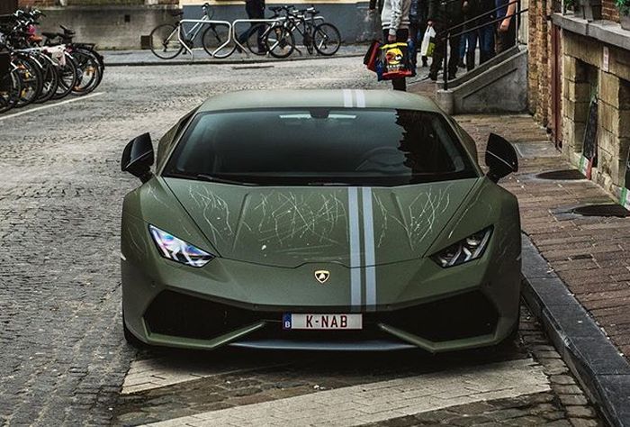 gif_animation ベルギーにて、「俺の車(3000万円)がクソガキにイタズラされこうなった…」画像が話題になっていました。この車、戦闘機をコンセプトに製作されたランボルギーニ(ウラカン LP610-4 アヴィオ)だそうで、世界限定250台の激レアモデルだそう。
