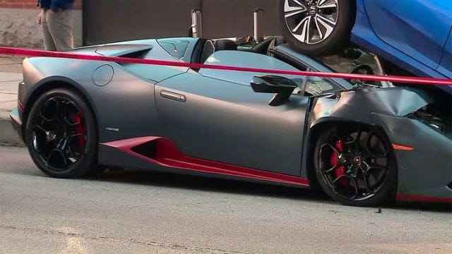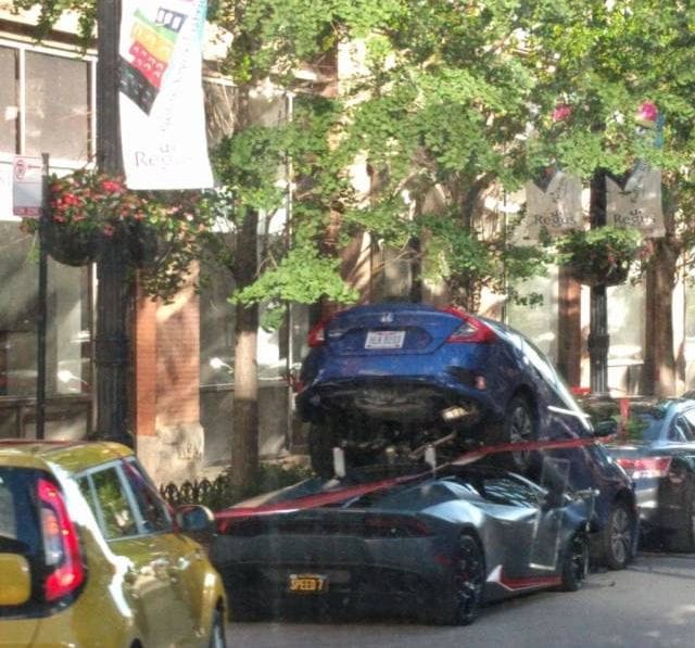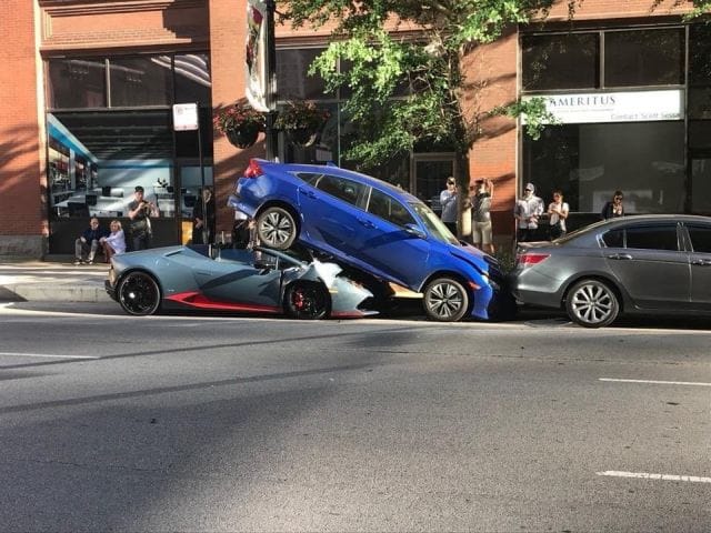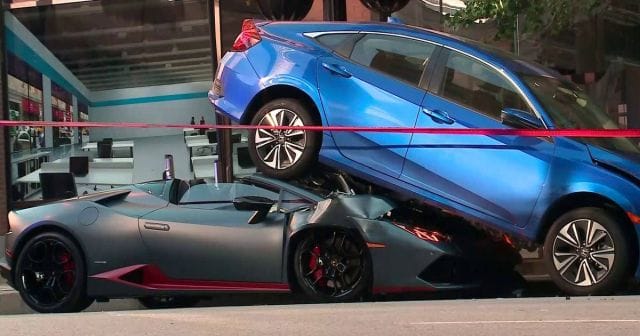 アメリカ・シカゴにて、ホンダ・シビック(約280万円)がランボルギーニ(約3000万円)の上に乗り上げ破壊するという事故が話題になっています。画像&動画。