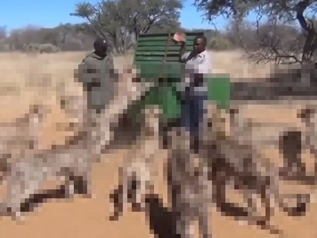 アフリカのサバンナで、「チーター」の群れに生肉をあげる仕事が怖すぎると話題の動画。自然保護区のレンジャーと思われる2人の男性。一歩間違えれば死…。