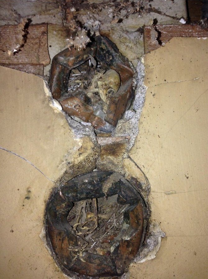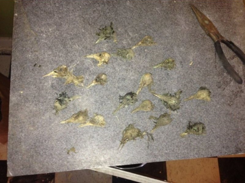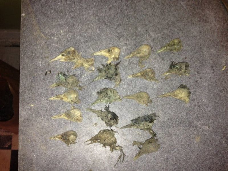海外にて、引っ越し先の家をリフォーム中、台所の棚裏のパイプの中から、「18匹分の鳥の頭」が発見されたという投稿画像。この家で一体何が行われていた…?