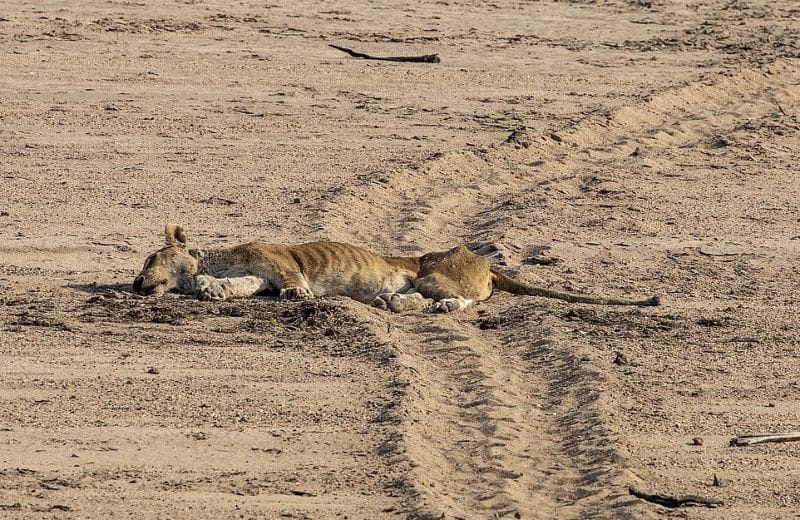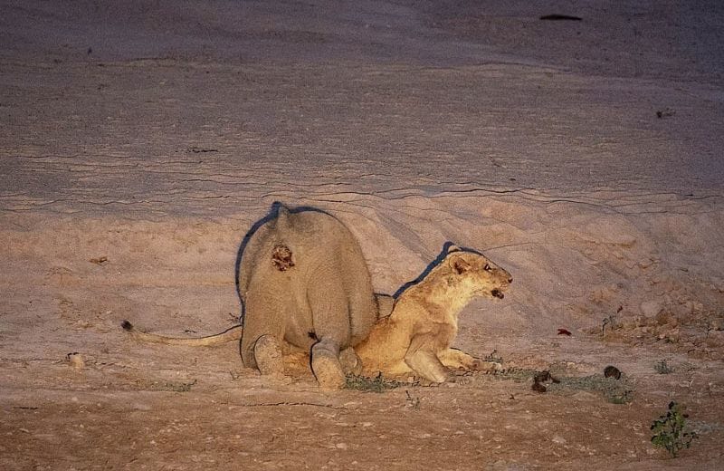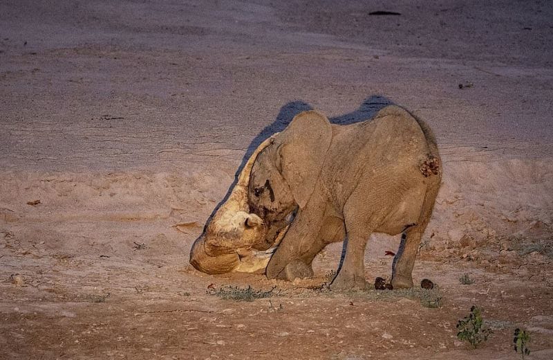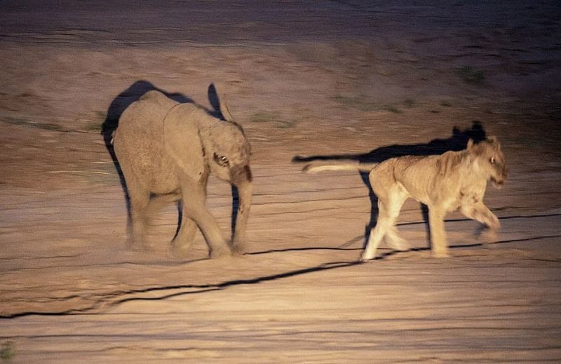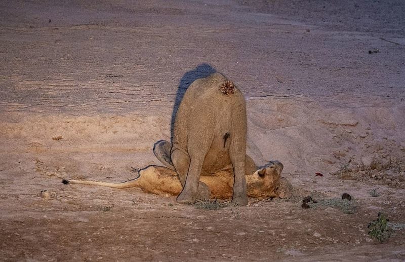 ザンビア・サウスルアングア国立公園で、1頭の雌ライオンに襲われた子象が、雌ライオンを体で押し潰し続け、その攻撃で衰弱した雌ライオンはその後死亡した・・・という画像。雌ライオンはそもそも飢餓状態にあったようだ。[5]images