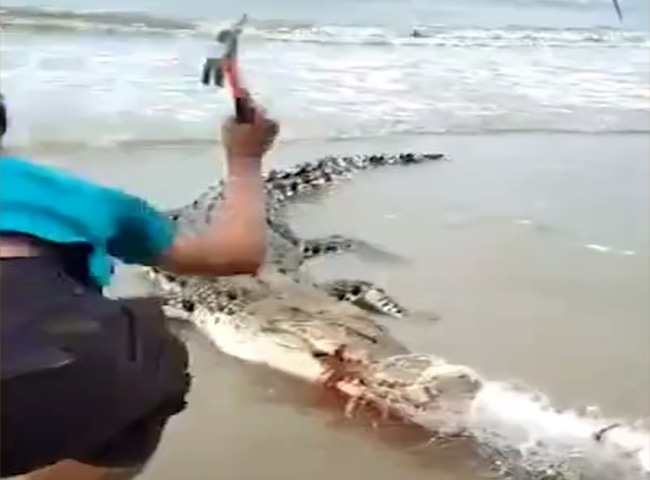 【衝撃映像】東南アジアの漁師、海に現れた巨大ワニをハンマーで殴り殺してしまう・・・