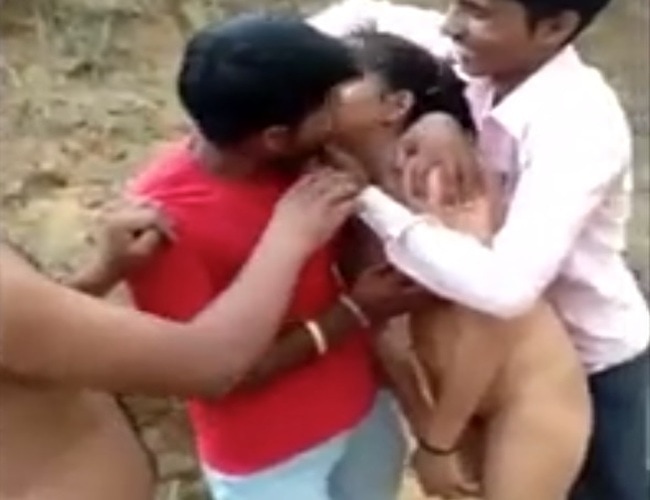 インドにて、外でイチャイチャしていたカップルが自警団に捕まり、全裸にされ、彼氏の目の前で彼女が辱めを受けている一部始終。正義のセクハラ。