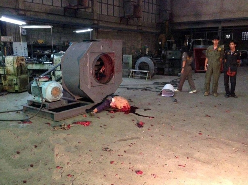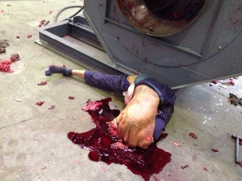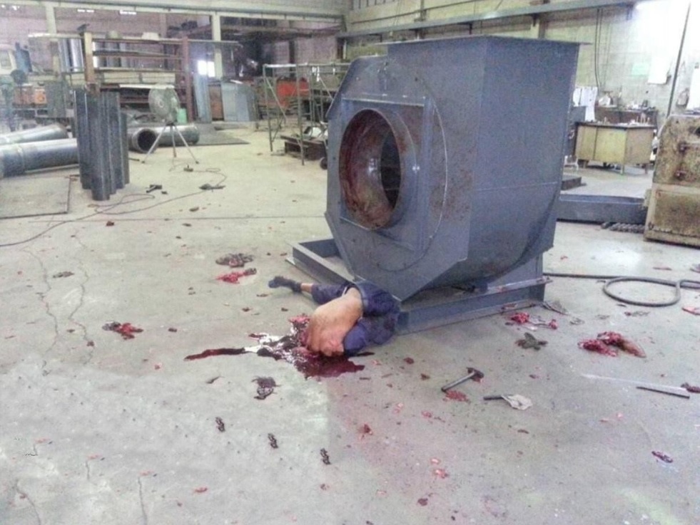 gif_animation タイにて、2013年に発生した事件。超巨大換気扇(ファンブレード)の修理作業員が内部に巻き込まれ(吸い込まれ)、とんでもない事になった画像。[9]images