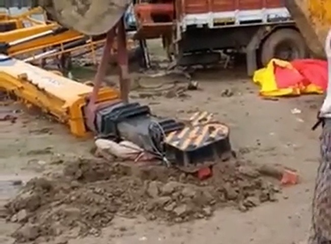 gif_animation インドにて、約20トンのクレーンが倒れ、運悪く潰された建設作業員の姿。