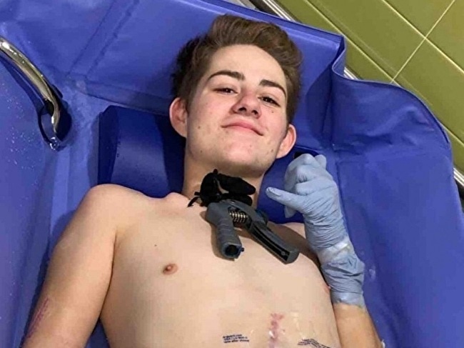 gif_animation アメリカにて、18歳まで健常者として生きてたにも関わらず、ある日突然、事故により右腕、両足、生殖器、尿路、骨盤、直腸の一部を失った少年の画像。これは…。