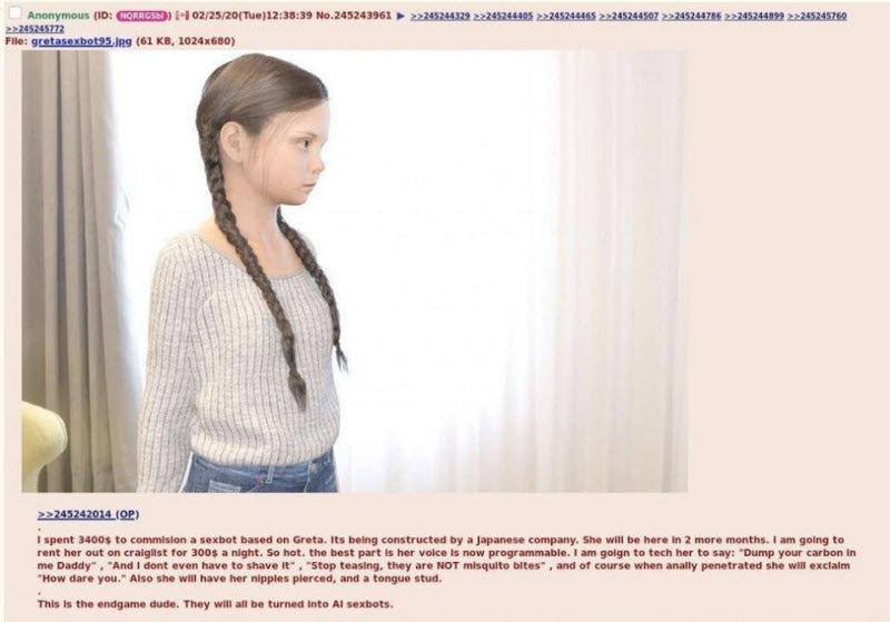 海外のネット上で、度々世界を騒がせているスウェーデンの環境活動家、「グレタ・トゥーンベリ(16)」さんそっくりに作られたラブドールが3万5千ドル(約370万円)で売りに出され、話題になっているよう。もうめちゃくちゃ・・・。[3]images