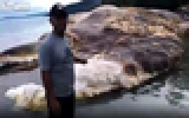 gif_animation 海外動画サイトに昨日付でアップされ話題の、東南アジアの海で発見された巨大イカの死骸。本当に ”イカ” なのかは不明だが、数十人は丸呑みにできそうな大きさ。