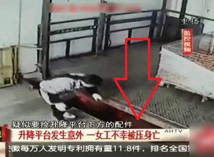 gif_animation 中国の工場で、女性作業員がリフトの ”絶対に入ってはいけない隙間” に落ちた部品を取ろうと体を入れ込んだ瞬間、リフトが動き出し帰らぬ人となる動画が話題に…。