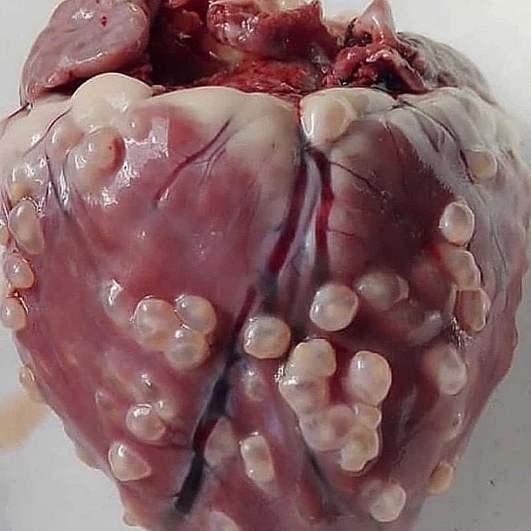 怖い1枚。寄生虫に支配され死亡した人間の心臓取り出したらすごい事になってた。情報によると嚢虫症(のうちゅうしょう / サナダムシの幼虫によって起こる組織感染症)による死。 かなり【閲覧注意】。(※ TOP画はイメージ)
