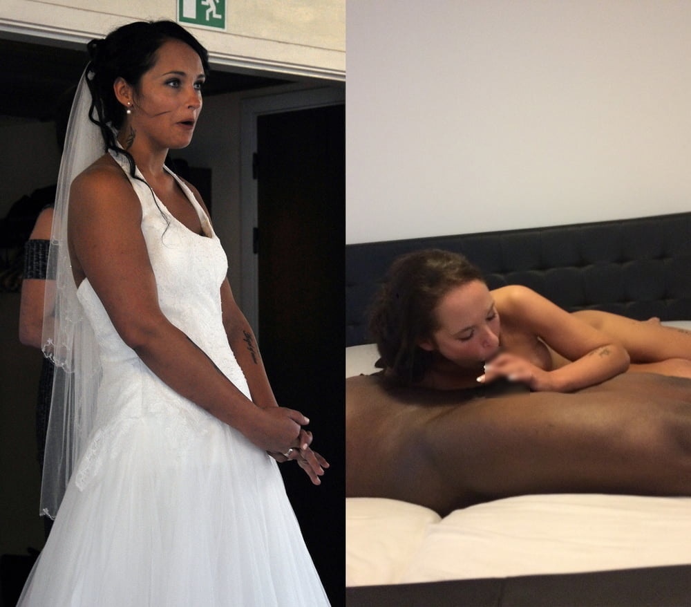 これは離婚必須か…。海外投稿サイトにて、同じ白人女性の「白人男性との結婚式の画像」と「黒人男性と浮気セックスしてる画像」が並べられた模様…。[15]images