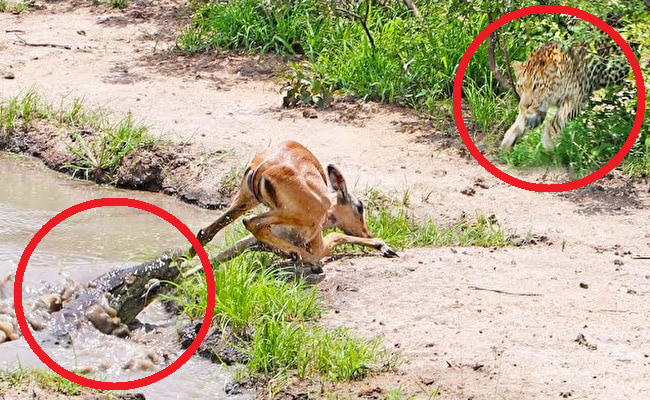 南アフリカ・クルーガー国立公園にて、川でワニに捕まったインパラが、奇跡的に陸に逃げる事に成功するも、わずか3秒後にヒョウに捕まり食べられる衝撃映像。