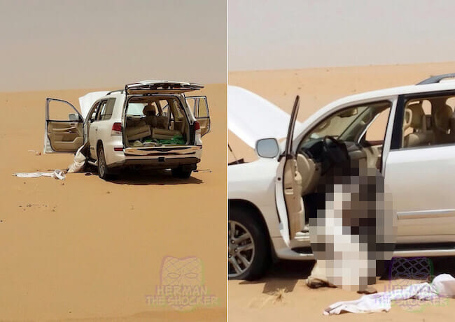 サウジアラビアにて、レクサスを運転していた男性がサハラ砂漠で立ち往生。7日後、捜索隊が見つけた彼の姿は干からび、真っ黒く変色していた。ちなみにガソリンや水は完全に使い果たされた状態だったとの事。開け放たれたトランクやドア、ボンネットがどれだけ過酷かつ絶望的な最期だったかを物語っている…。 GIF動画+写真。