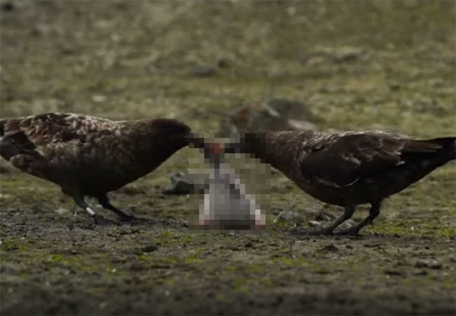 gif_animation 海外の動画サイトにて、ペンギンの母親が目の前でペンギンの天敵として知られる「トウゾクカモメ」に子供を捕食される動画。関連動画で子供をさらいに来た天敵を皆で殺し見事、日頃の復習を果たす…。