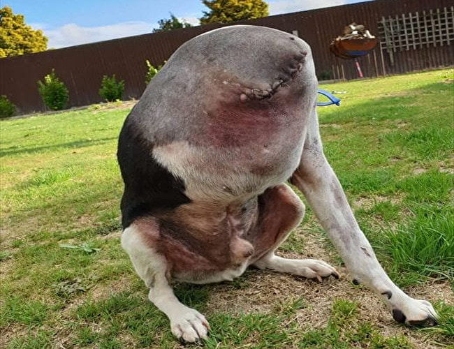 ※ 実はこれ、片足を失った犬が背中の毛繕いをしている様子。頭を後ろに曲げているので手術跡が頭の位置に来ている。通常時の様子がこちら ↓