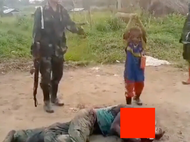 gif_animation コンゴにて、ISISメンバーの息子とされる、まだ5歳ほどの子供が捕虜(コンゴ民主共和国軍の兵士)を斬首している恐ろしい場面。どんな大人に成長するのだろうか…