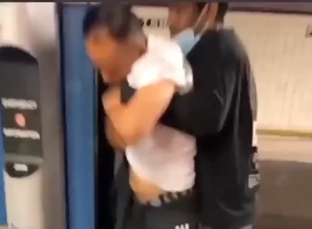 gif_animation 米ニューヨークの地下鉄で、アジア人の男性が黒人男性に羽交い絞めにされ、別の黒人男性に殴られ続ける動画が流出、炎上しているよう。暴行された理由は不明。