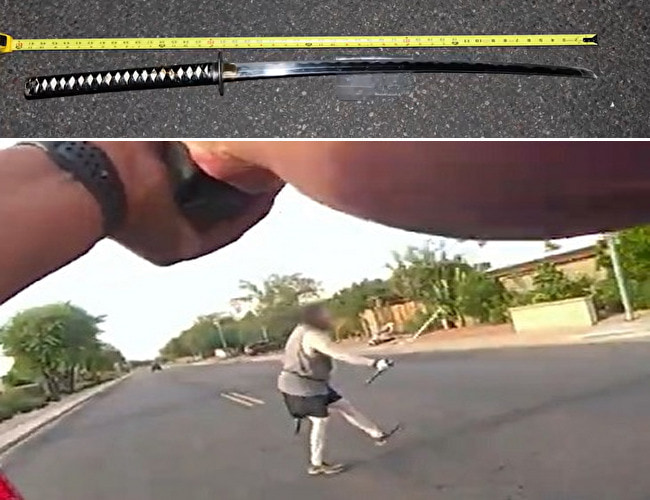 gif_animation 海外で稀に発生する、「日本刀」を使用した事件の最新動画(2022/9/10)。アメリカにて、街中で日本刀を持って暴れている男がいるとの通報を受けた警察が現場に直行、日本刀を振りかざし、向かってきた男との殺し合い。勝ったのはもちろん…。