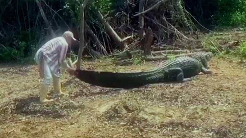 ※ クロカイマンの最新の犠牲者の姿。両手と下半身を食い千切られ、”ダルマ” 状態に…