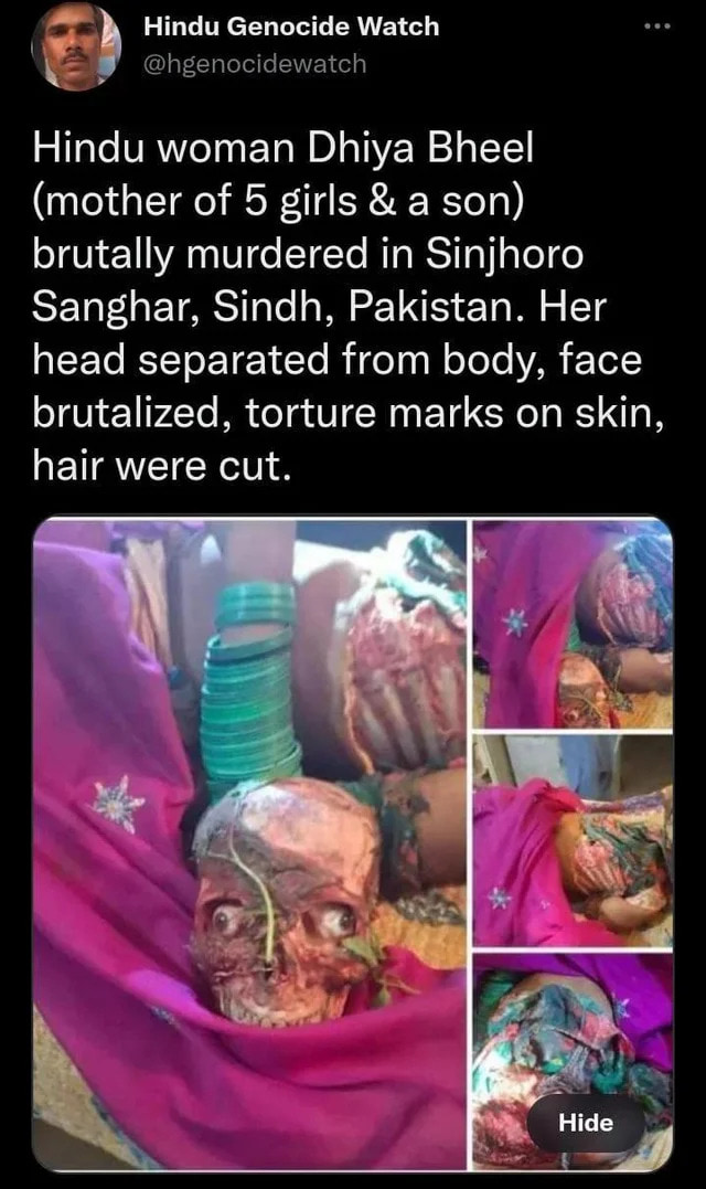 ※ 記事内に【超!閲覧注意】画像を含みます パキスタンでは近年、ヒンドゥー教徒の未成年少女らの誘拐、レイプ、強制改宗、結婚などの事件が多発しており、紹介する動画像は「集団レイプされた後の14歳の少女がショックで発狂する動画」や「18歳~19歳少女の実際のレイプ事件の動画」「42歳の女性が集団レイプされ、頭を切断、皮を剥がされるという事件の画像」など、凄惨を極めたもの。(※ TOP画はイメージ)
