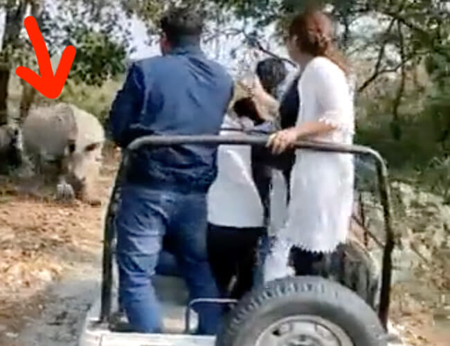 gif_animation インドにて、サファリパークでサイが観光客が乗った車を襲撃し、ひっくり返してしまう衝撃動画。この事故の結果により女性が骨折、他全員が軽症を負ったとの事。
