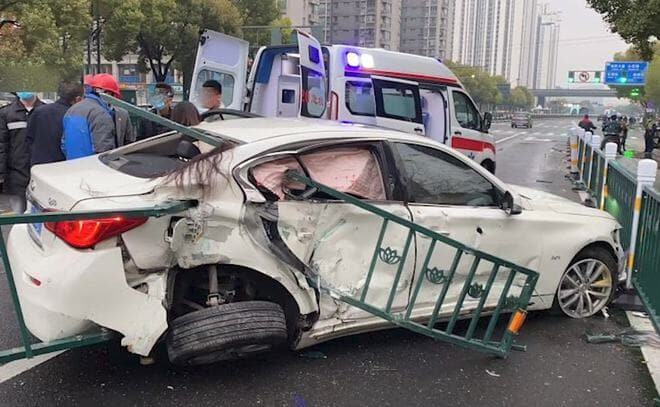 gif_animation 中国にて、女子大生(22)が早朝にクラブから帰宅途中、男性友人が運転していた車がコントロールを失いガードレールに衝突→ガードレールが彼女の顔に突き刺さり即死…という衝撃の現場画像。同乗していた別の女性は無傷だった模様。[4]images