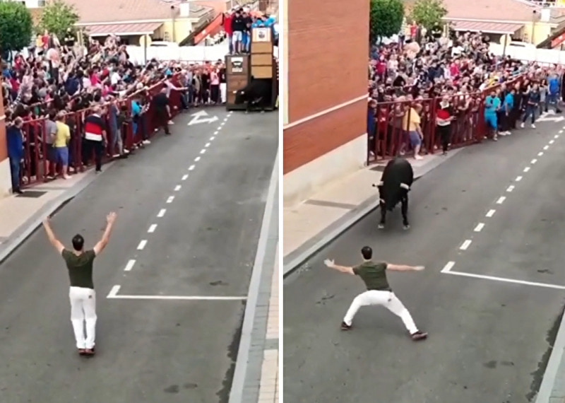 gif_animation ダーウィン賞(世界一ヒドい死に方)ノミネート動画、最新。スペインの牛追い祭りにて、「ここにいたら死ぬよ!」という忠告を守らなかった酔っ払いの末路・・(※ TOP画の男性ではなく、その後ろにいる酔っ払いです)