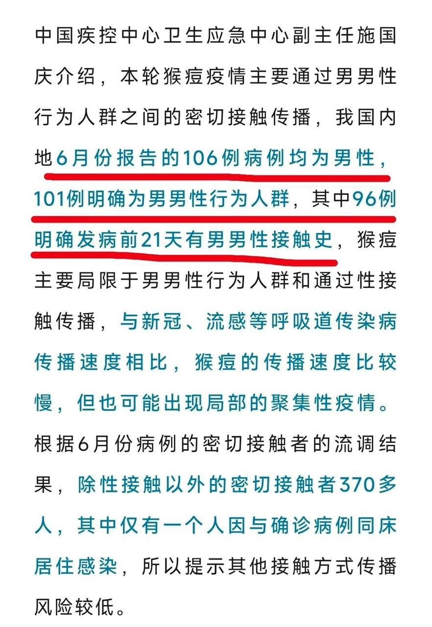 「6月に報告されたサル痘患者106人の内、101人が ”男性同士の性行為” により感染した」