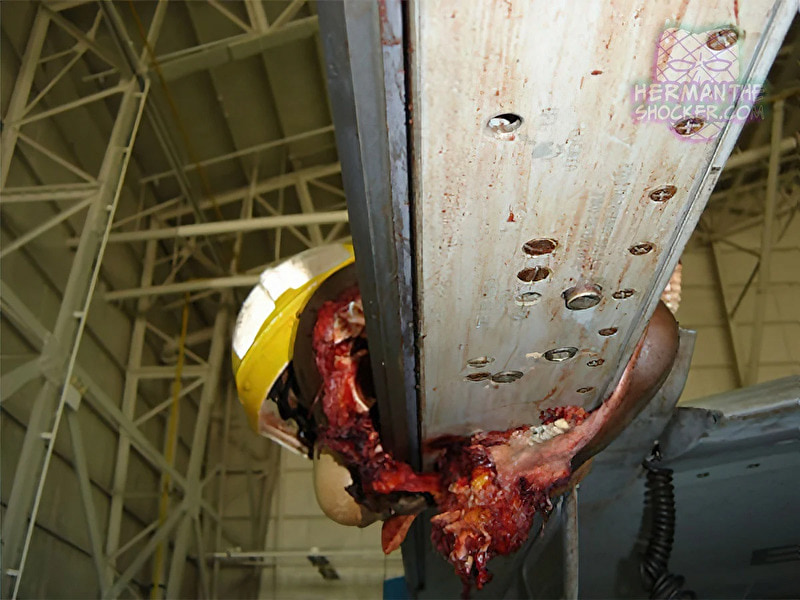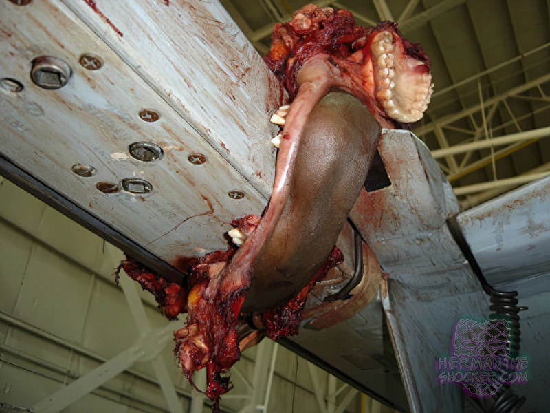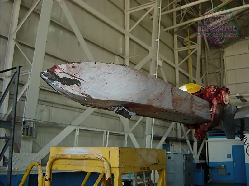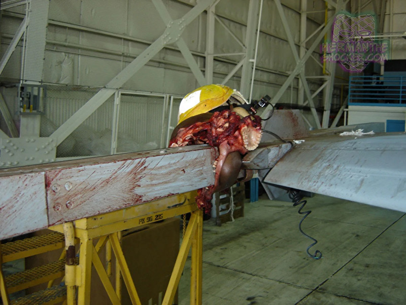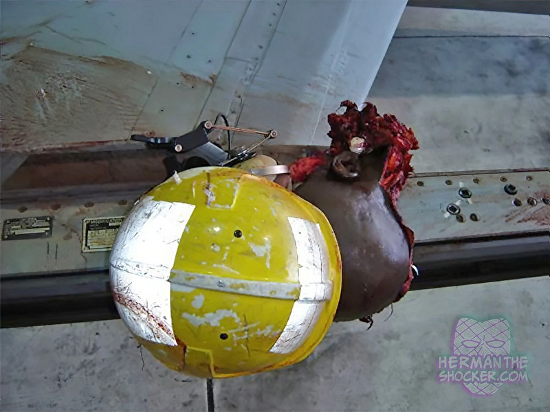 gif_animation アメリカにて、2008年に発生した、軍艦から離陸中であった戦闘機(最高速度はマッハ2を超えるが、事故時のスピードは不明)と衝突、ありえない姿となって即死した航海士の画像。有名な1枚(8枚目)を含む、一連のギャラリー[9]images