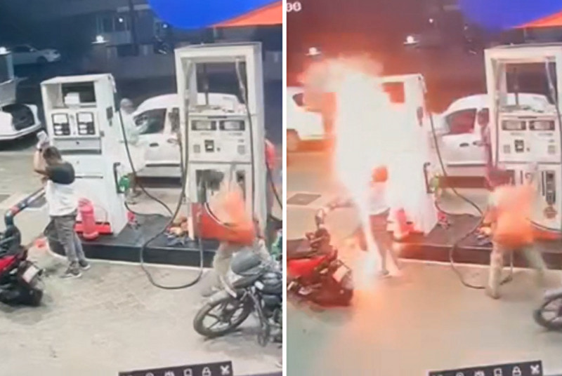 gif_animation インドにて、ガソリンスタンドで挙動がおかしい人に絶対に近付いてはいけない理由・・・。ガソリンを被り始めた男は、そのまま焼身自殺。オレンジのTシャツを着た男性は間一髪で逃げる事に成功した。自殺者である男はその後死亡、2つの角度から。