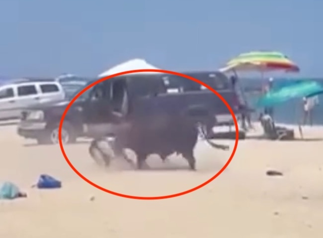 gif_animation 海外のビーチでゴミ拾い中の人々の元へ現れた獰猛な牛。皆が逃げ回る中、なぜか1人の女性活動家は逃げずに牛に喧嘩を売り、”重傷” を負わされたようだ…。