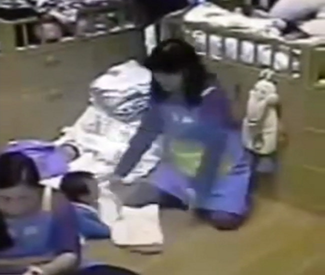 gif_animation アジア(おそらくは中国)の保育園で子供が死亡。当初 ”事故による窒息死” と思われたが、「この監視カメラ映像」で暴力的な保育士の女が子供を意図的に窒息させる一部始終が記録されており、女は殺人の容疑で逮捕された… という恐怖映像。