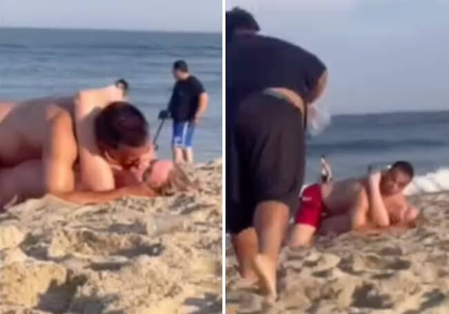 gif_animation 欧米の海水浴場で、多くの人々がいる中セックスしようとしてたカップルが、”根は真面目” な陽キャグループに突撃されそれを止められる一部始終動画。