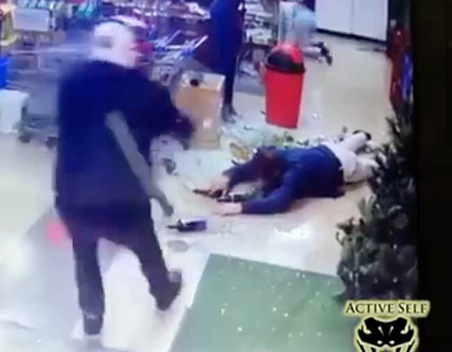 gif_animation 海外のスーパーで、強盗に襲撃され頭を撃たれた男性(店主)が、止めを刺しに来た強盗を ”うつ伏せに倒れた状態” から急にぶっ殺してしまう衝撃動画。老人はその後一命を取り留め、強盗はその場で死亡している。