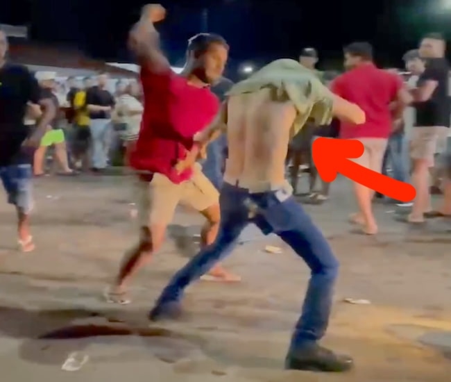 gif_animation 海外の路上で、男2人にボコボコにされてるヒョロ男。しかしヒョロ男は刃物を隠し持っており、一瞬の反撃のみで相手の男の大腿動脈を切断、その後男は出血性ショックにより死亡するという事件の衝撃動画。