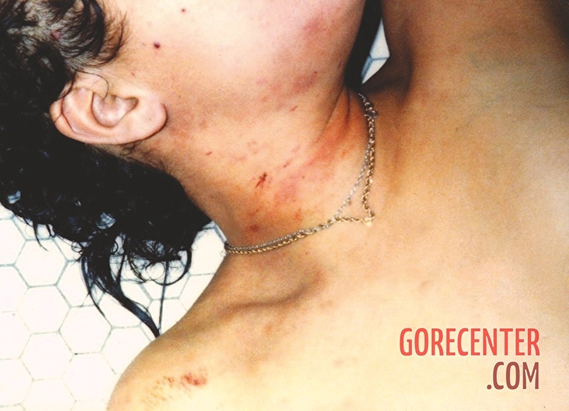 gif_animation 海外にて、家に帰ったら嫁が「シャワー中に転倒して死んでいた」という通報があった実際の現場画像。検死の結果、彼女の首には痣があり、白目には血の跡があった。それは明らかに絞殺の証拠であり、その後殺人犯として ”夫” が逮捕された。