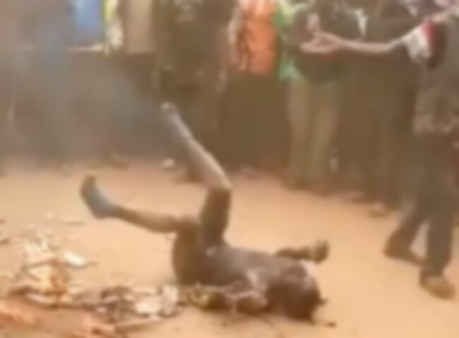 gif_animation ナイジェリアにて、窃盗容疑で民衆に捕まった男が、”世界で最も痛い処刑方法” こと「生きたまま丸焼き」を実行された現場動画。その後すぐに死亡したそう。