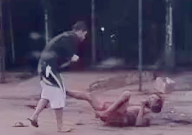 gif_animation ブラジルにて、好戦的な若者と喧嘩になったホームレスが、ナイフで滅多刺しにされ死亡した事件の衝撃動画。少年はその後殺人の容疑で逮捕されている。